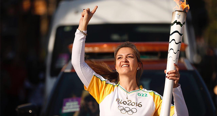 Sandra Giannoni Ferreira, a member of Atibaia Church of the Nazarene, carries the Olympic torch.