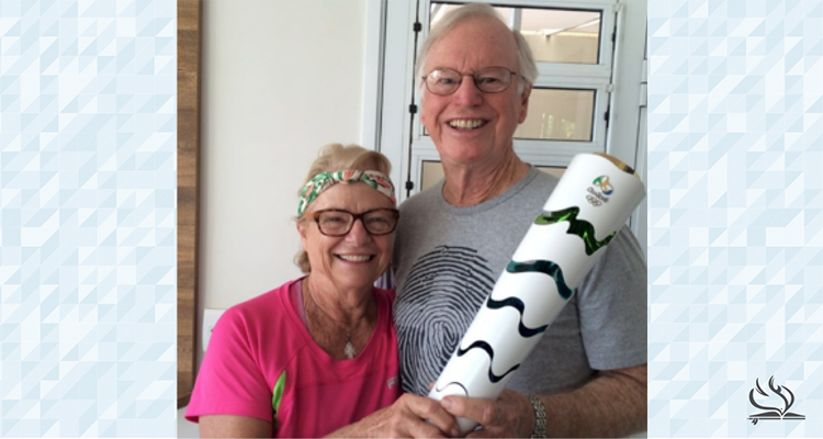 Retired Brazil missionaries Stephen and Brenda Heap hold the Olympic torch.