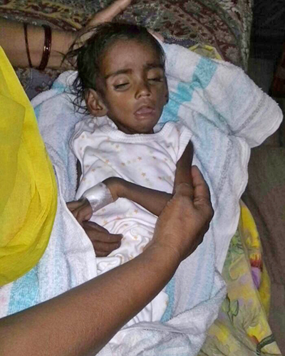 O bebê estava desnutrido para o ponto de morte e coberto em feridas escorantes. Sulochana assistiu como a criança lutou para respirar.